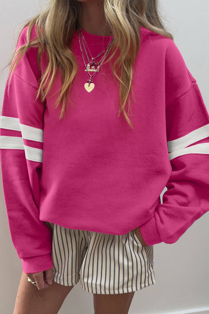 Drop-shoulder design keeps you comfy and chic. 🏈 Varsity stripes add a sporty, trendy vibe. Oversized fit for cozy, versatile wear.