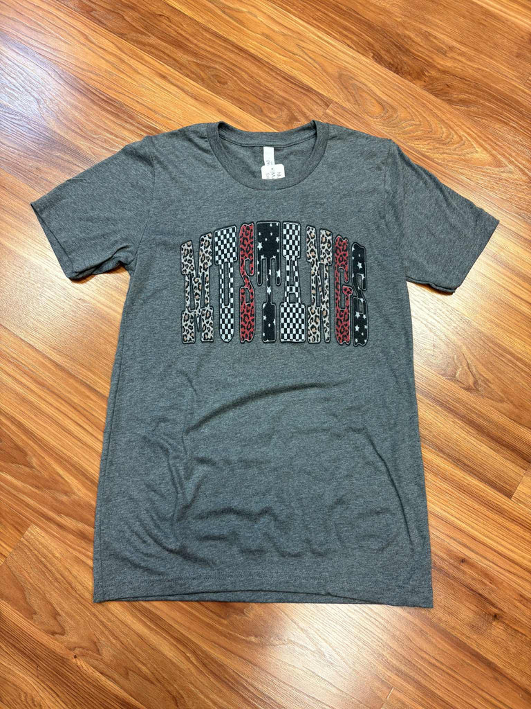 Mustangs printed with different designs in each letter with a black outline. Printed on a Deep Heather Bella Canvas T-shirt.