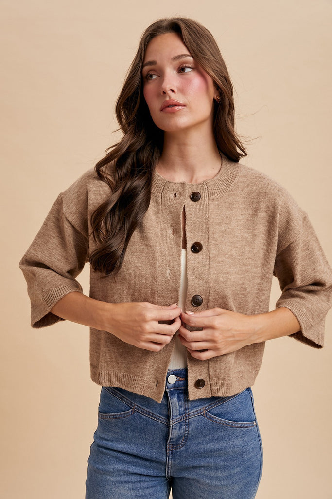 HALF SLEEVE BUTTON DOWN KNIT CARDIGAN - LIGHT WEIGHT SOFT KNIT FABRIC - ROUND CREW NECKLINE - BUTTON DOWN FRONT - HALF LENGTH SLEEVE - RELAXED FIT - BUTTONS CHANGE (6 TO 5)